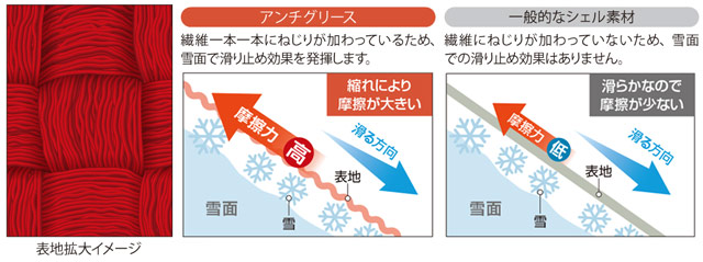 アンチグリース加工とは、生地表面を波うたせる(繊維に縮れを加える)ことで雪との摩擦を起こし、滑り止めの効果を出す加工のこと。滑落したとき、加速するのをできるかぎり防ぎます。