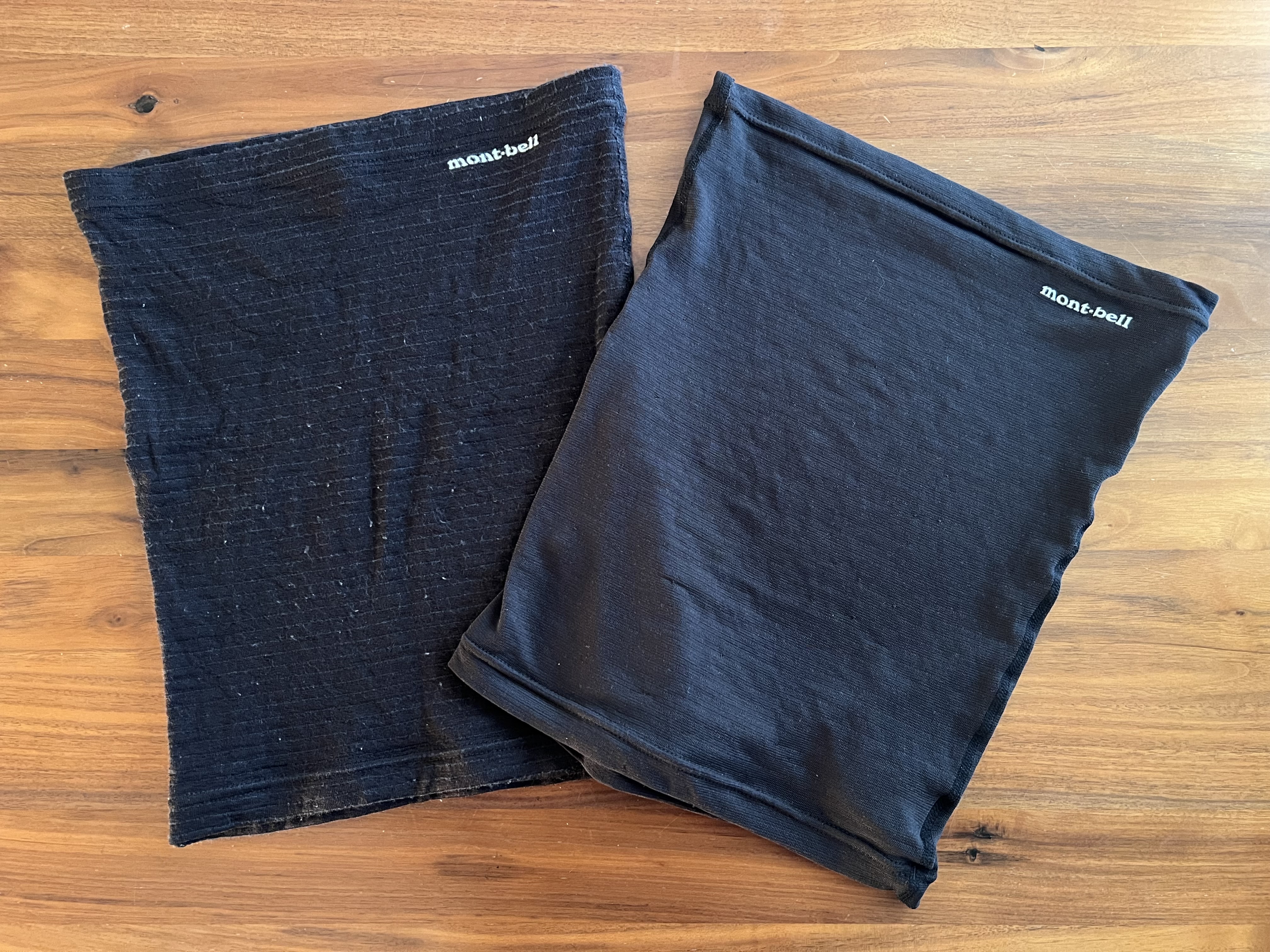 一番最初はコードなどがない"チューブタイプ"のネックゲーターを使用していましたが、首元に落ちて寒かったのでやめました(ゴムが内臓されているタイプもあります)。ヘアバンドにしたり多用途には使えますが、自分には合わず。