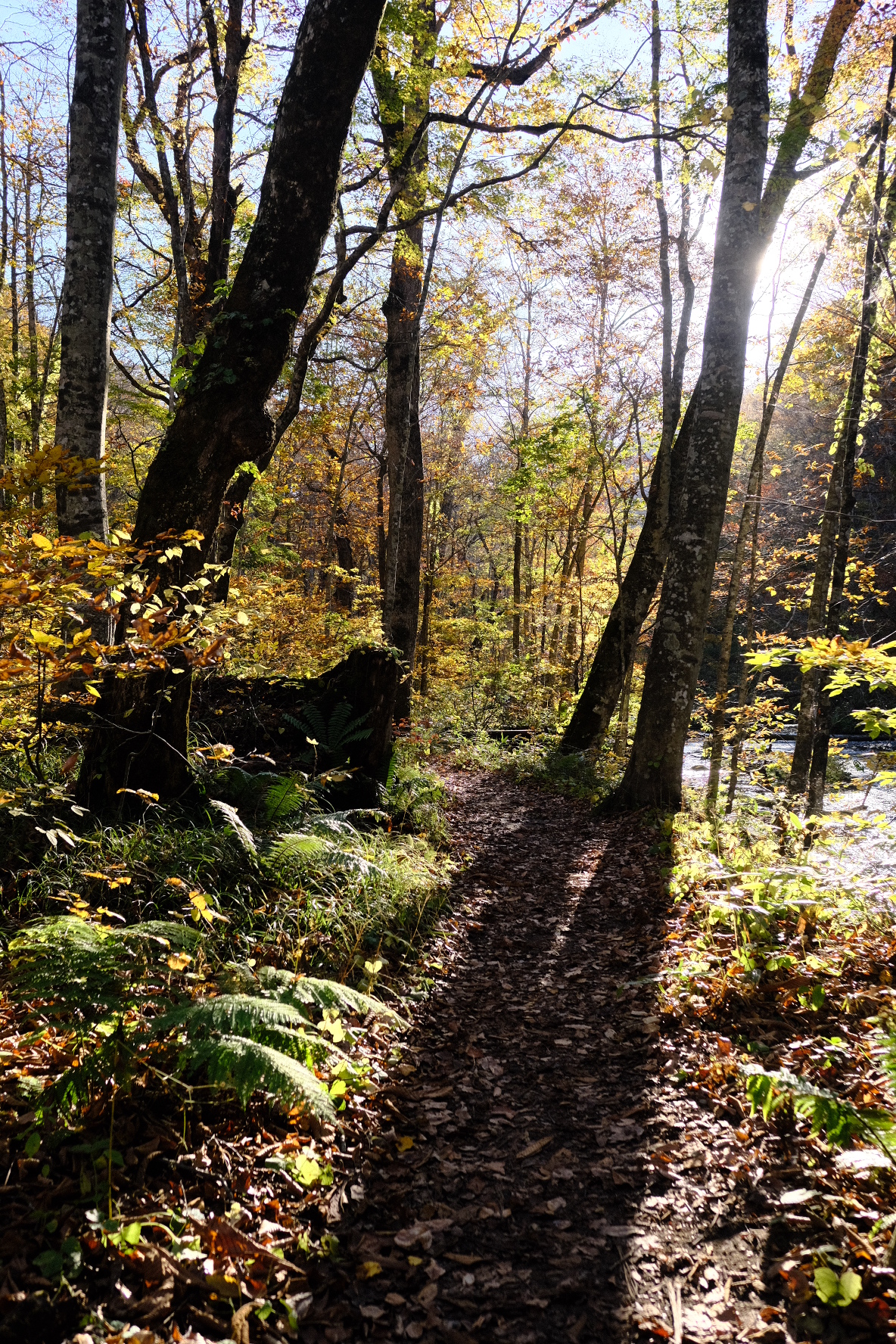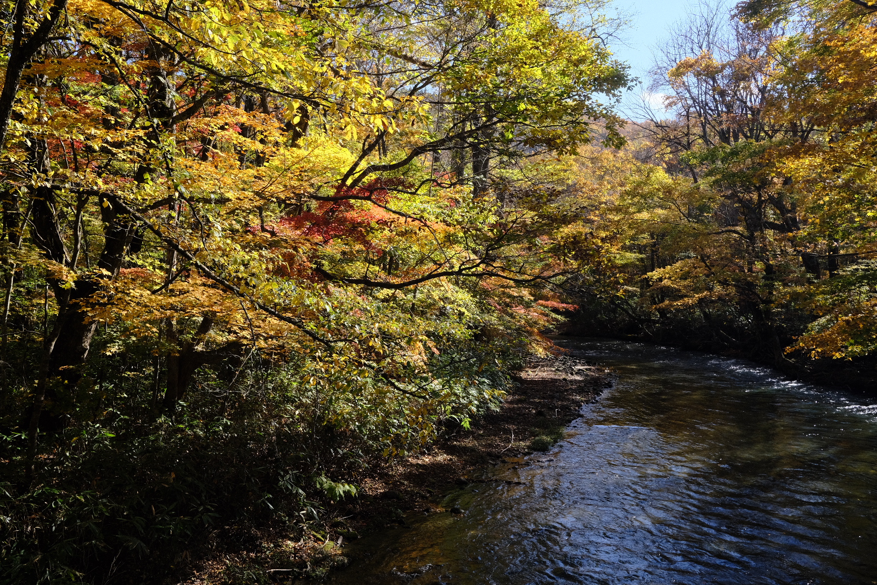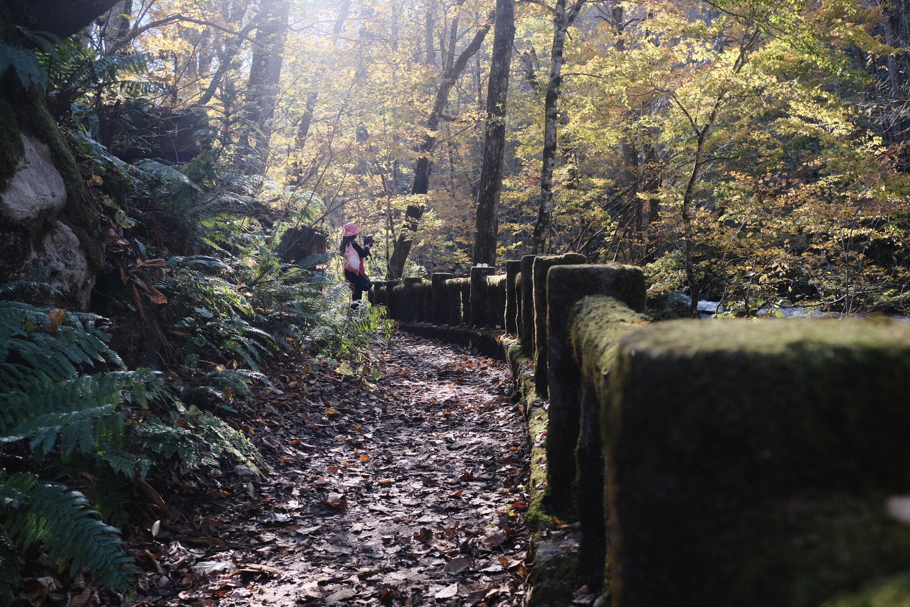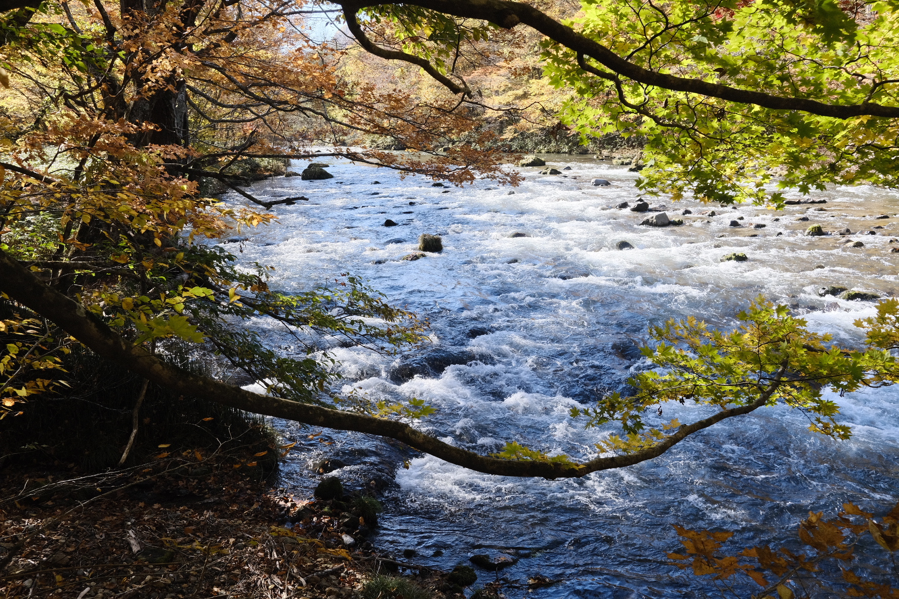 歩いたのは10月下旬ですが、15時を過ぎると渓流沿いは日陰が多くなり、明るい広葉樹林の紅葉は少し暗い印象に。輝く紅葉を楽しむなら、できるかぎり早い出発を。