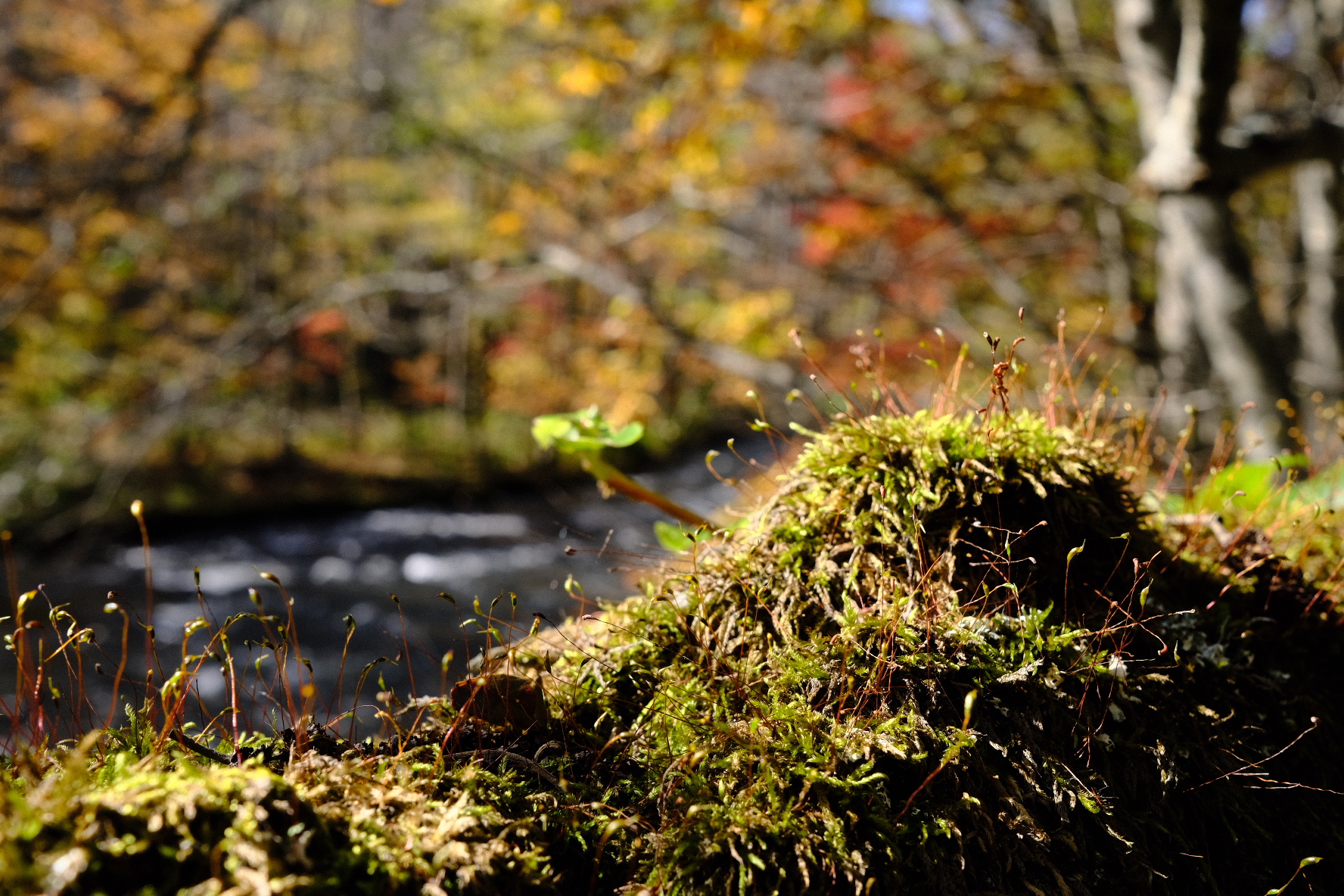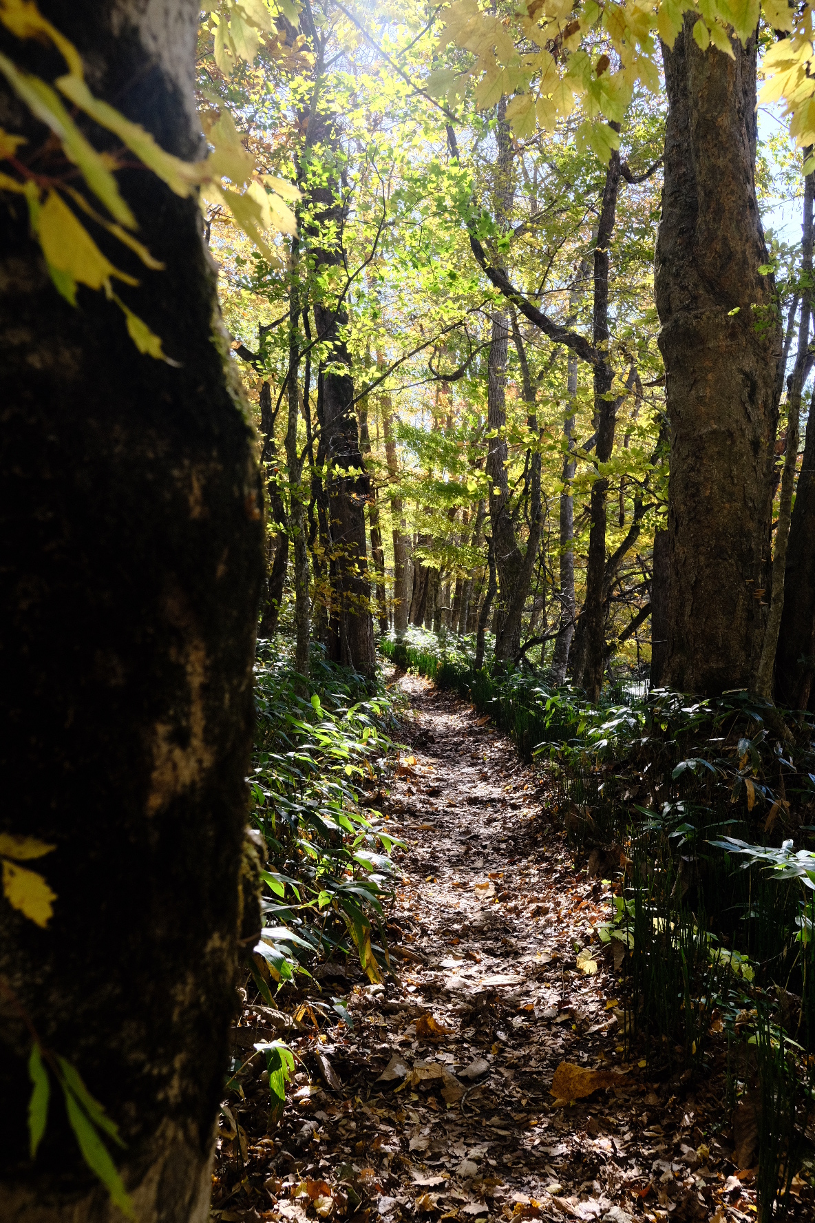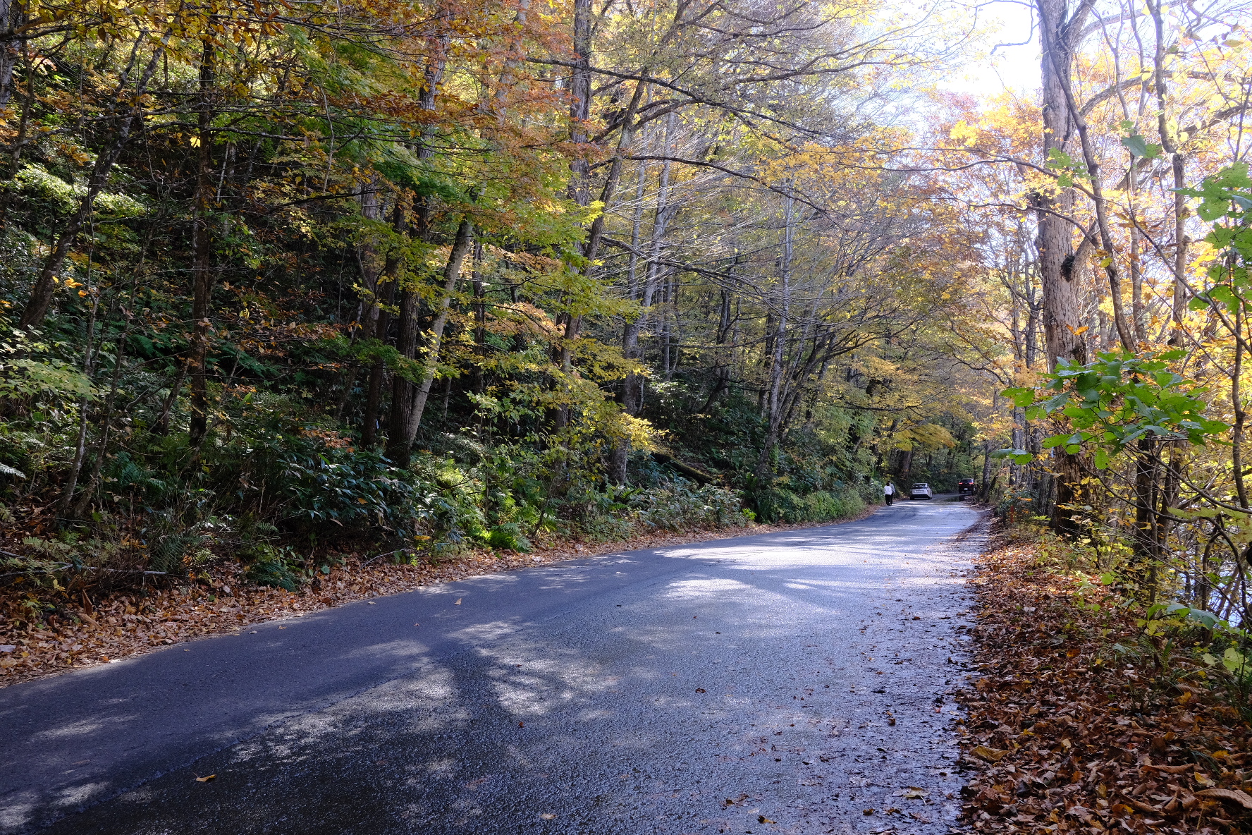 歩いたのは10月下旬ですが、15時を過ぎると渓流沿いは日陰が多くなり、明るい広葉樹林の紅葉は少し暗い印象に。輝く紅葉を楽しむなら、できるかぎり早い出発を。