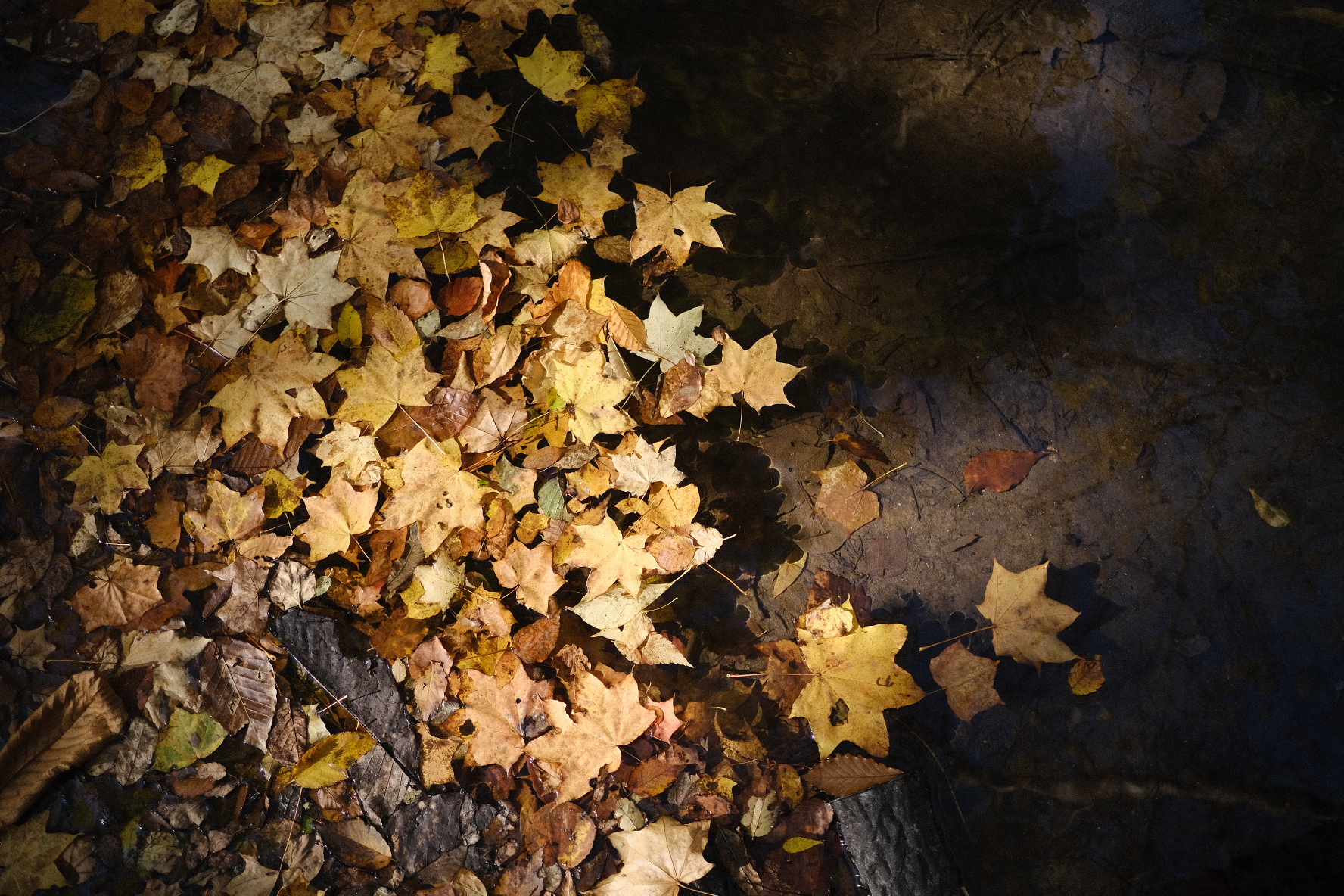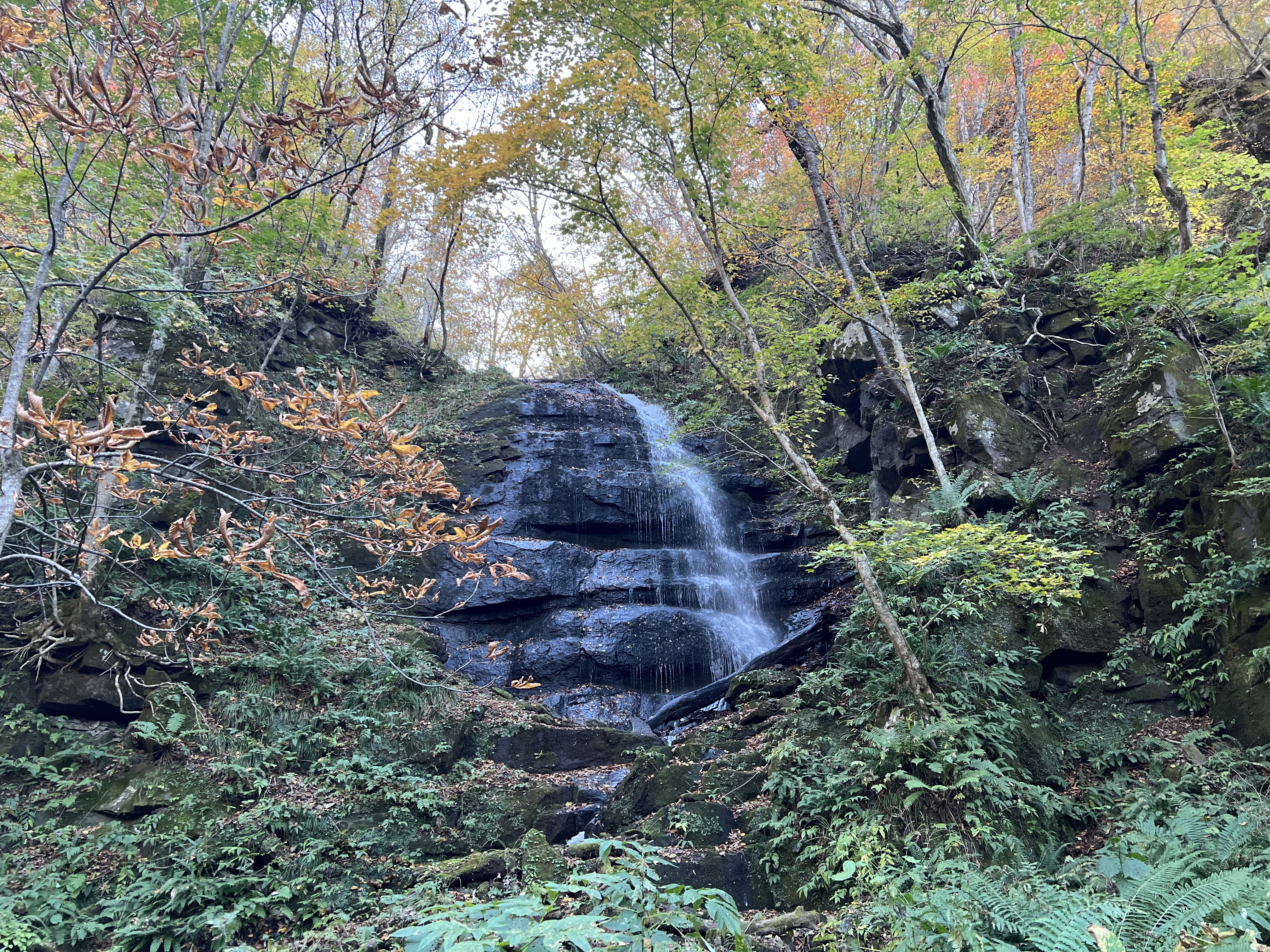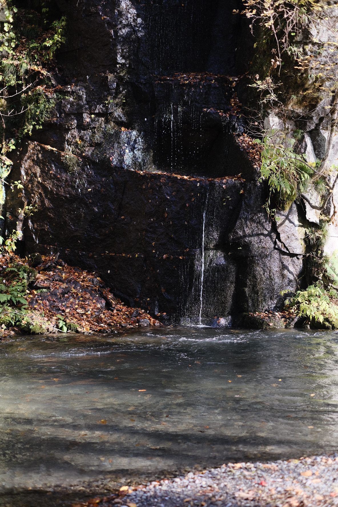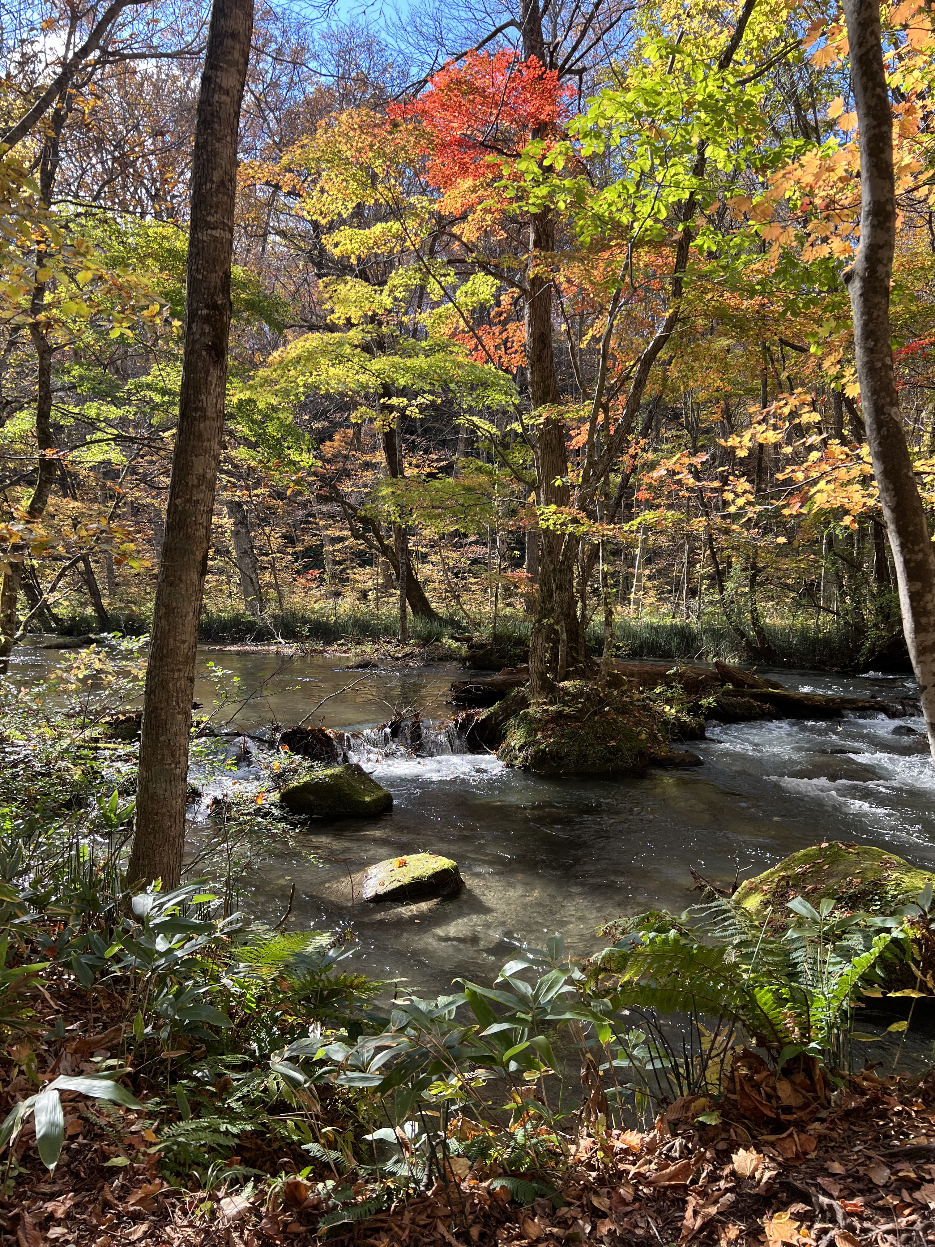 歩いたのは10月下旬ですが、15時を過ぎると渓流沿いは日陰が多くなり、明るい広葉樹林の紅葉は少し暗い印象に。輝く紅葉を楽しむなら、できるかぎり早い出発を。