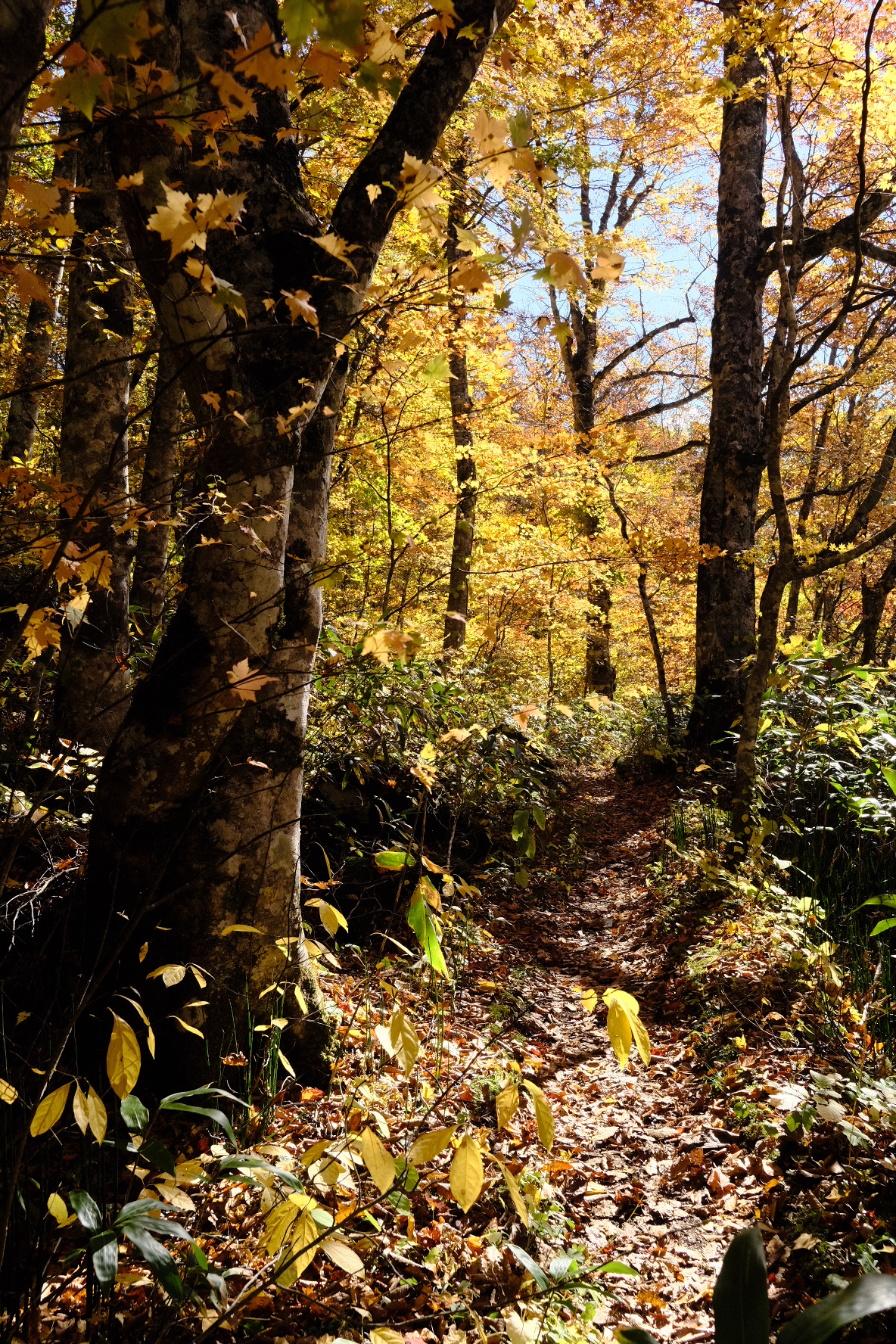 ハイキングコースは、東北自然歩道でもあります。ブナやカエデ類の、色鮮やかな広葉樹林の紅葉に包まれる。