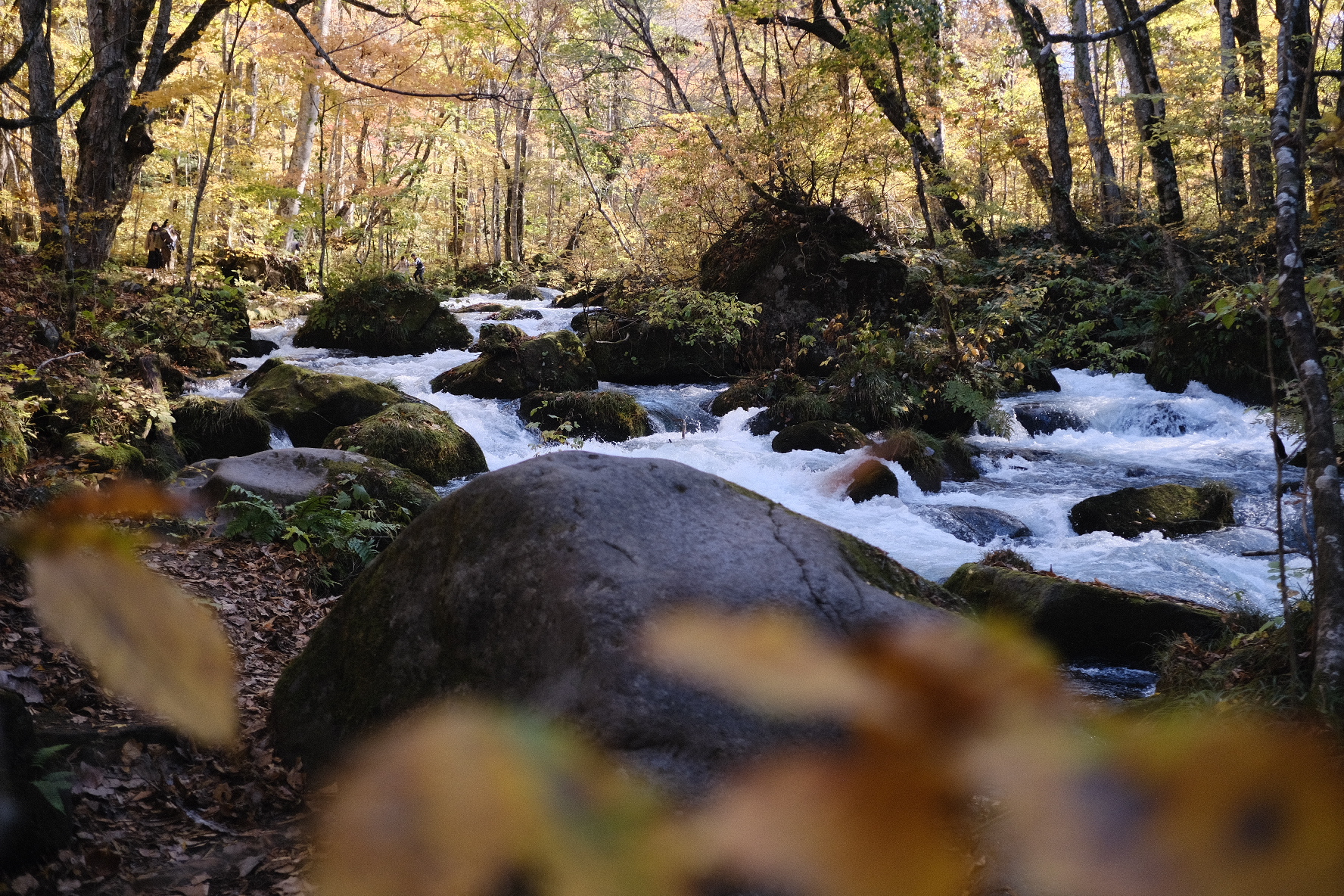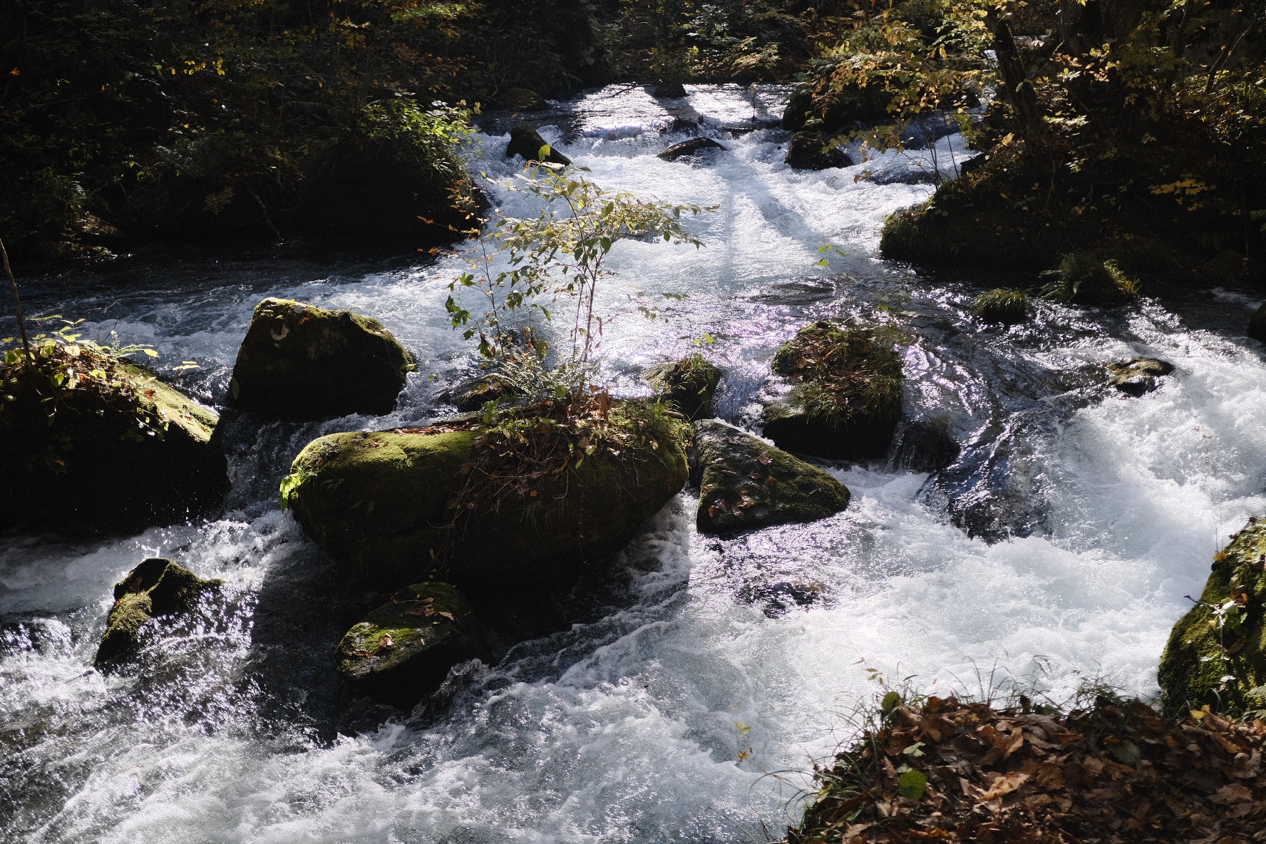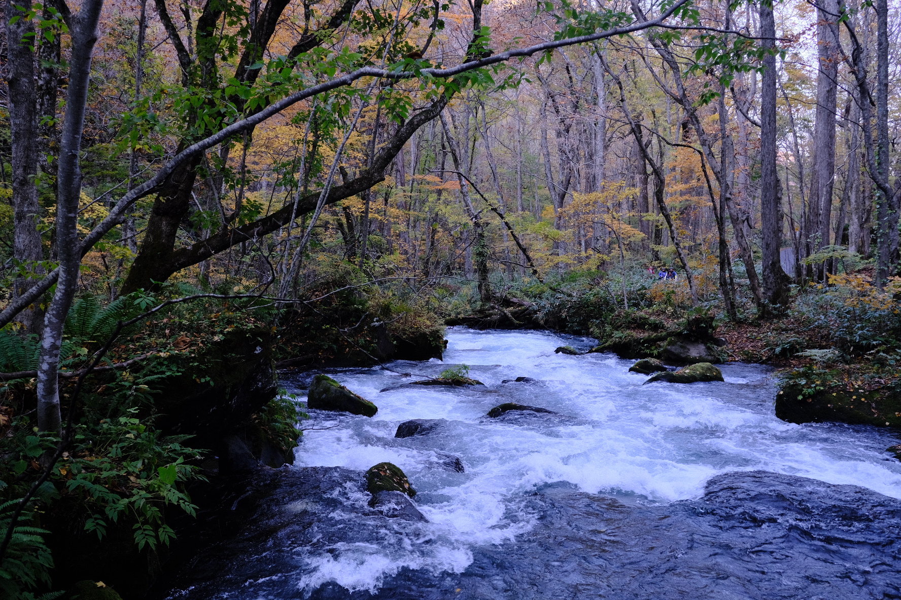 奥入瀬渓流を代表する「阿修羅の流れ」周辺に到着。全体的に穏やかな奥入瀬渓流ですが、このあたりは水量が多く、岩の間を勢いよく流れていました。