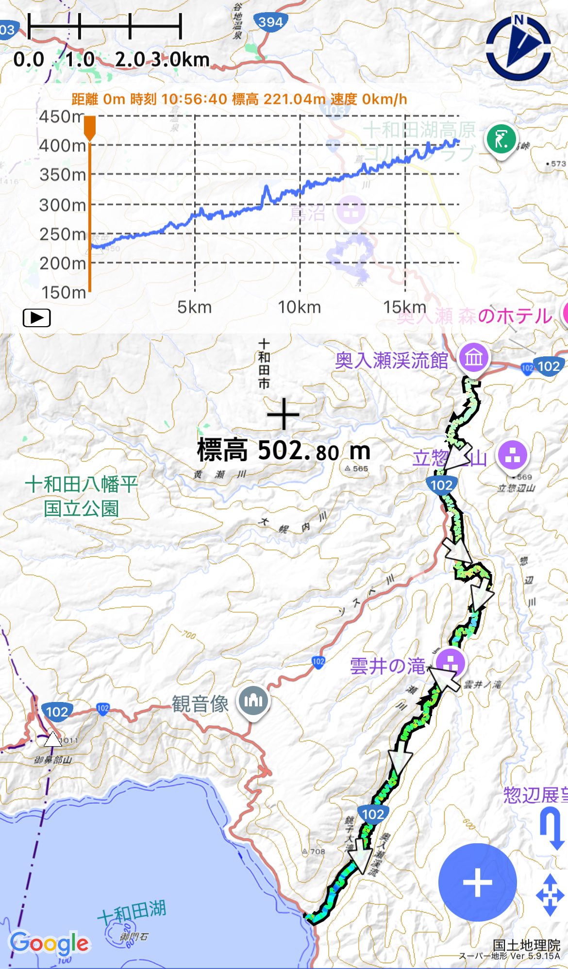 奥入瀬渓流館の標高が約250m、子ノ口が約400mなので、14kmかけての標高差は150mほど。渓流とほとんど同じ高さに車道と歩道がつくられているため、勾配が緩い、とても歩きやすいハイキングコースです。