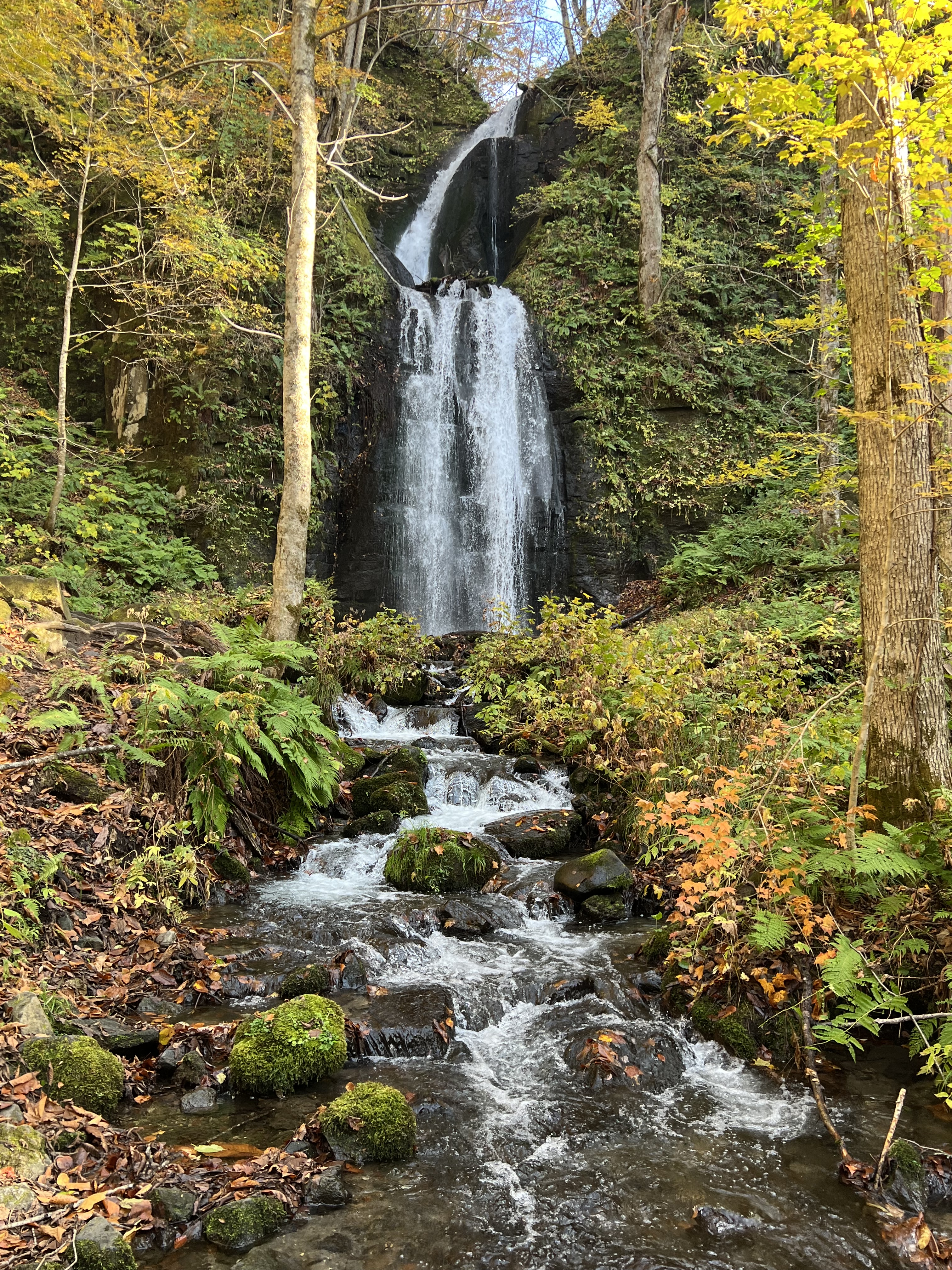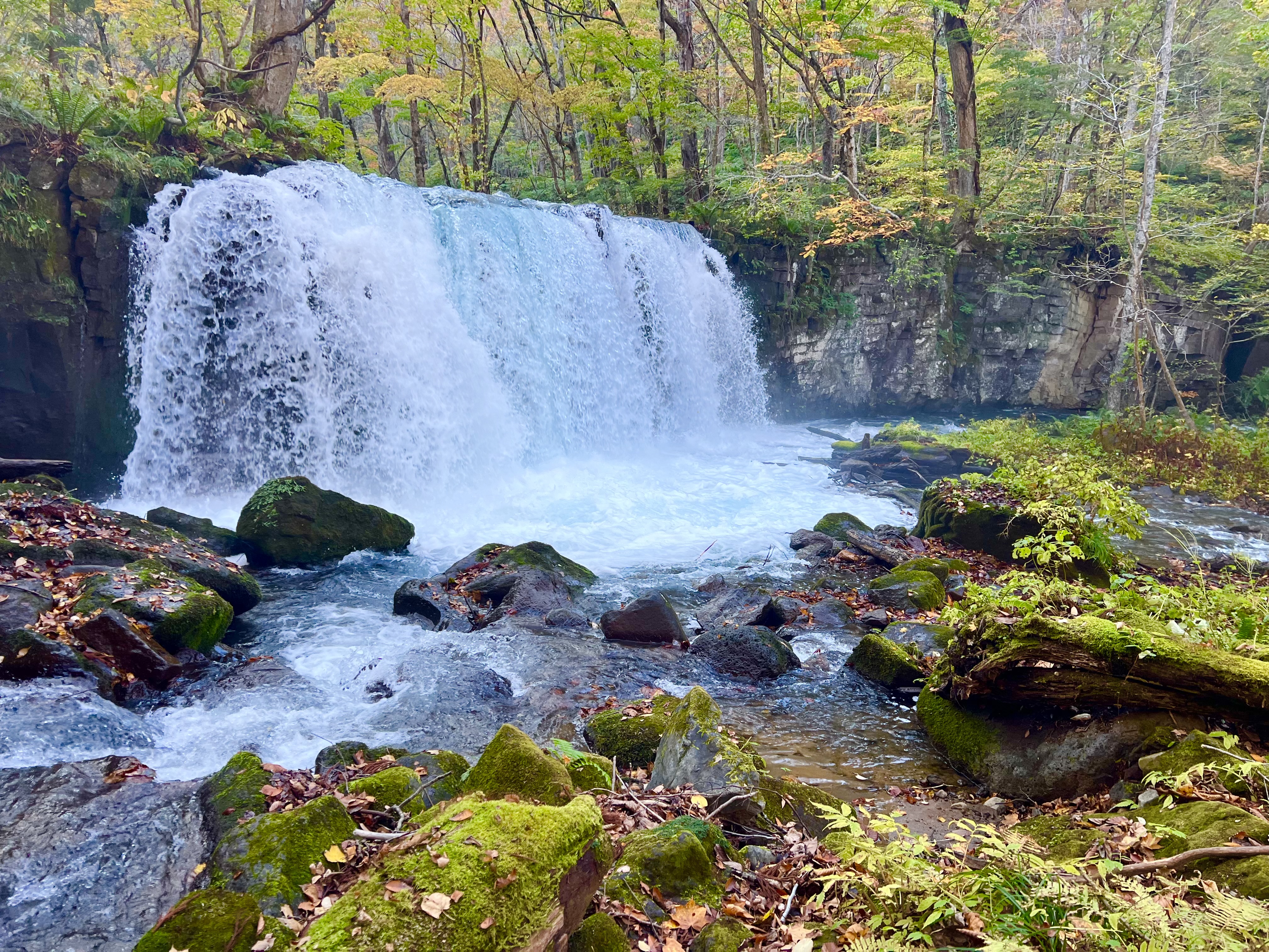 ラストの「銚子大滝」に到着。高さ7メートル、幅20メートル、奥入瀬渓流本流にかかる随一の滝。ハイキングコースの中で一番迫力があり、周囲の紅葉に溶け込む素敵な滝でした。