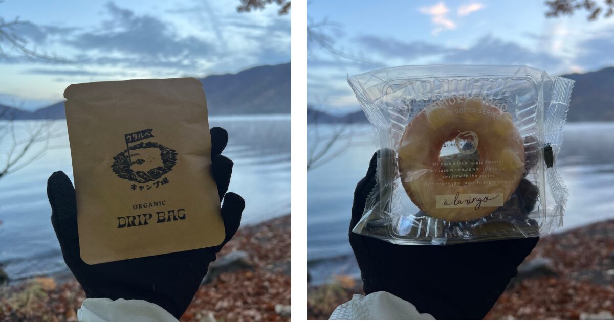 翌朝、受付で買ったドリップコーヒーと、奥入瀬渓流館で買ったりんごのドーナツを。気温は5℃で、手袋をしないと手が冷たい。