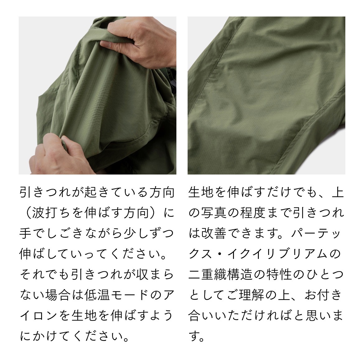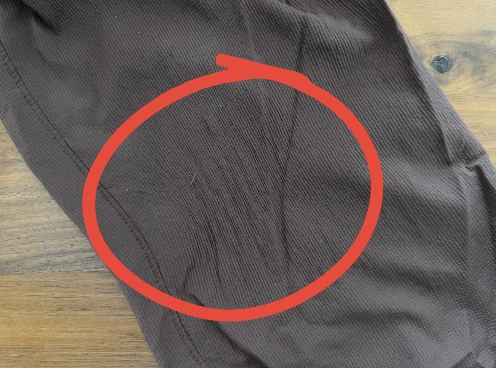 裏地が凸凹した二重織り構造のパンツは体毛と擦れ合ったり、糸のほつれや毛玉により細かく波打つ"引きつれ"が起こりがち(山と道のパンツも大体なりました)。