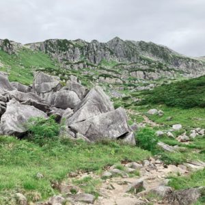 気付かぬうちに道を間違えていました。道は斜面をトラバースしていますが、どこからか岩の方へ進んでいて、「あれ、下に道がある」と。そのまま岩場を進み、正規の道に近いところで斜面を下りました。