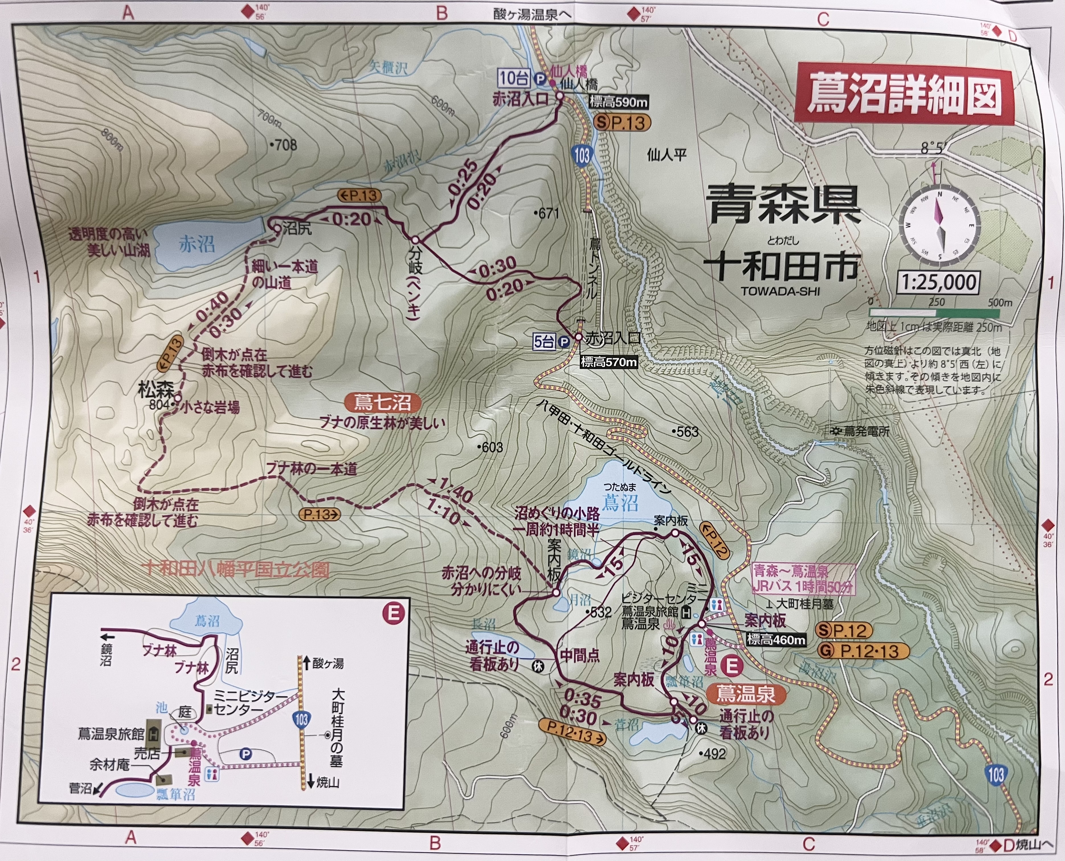 また、散策路は破線で「赤沼」と繋がっていますが、散策路で巡る6つの沼と「赤沼」を合わせて「蔦七沼」と呼ばれています。